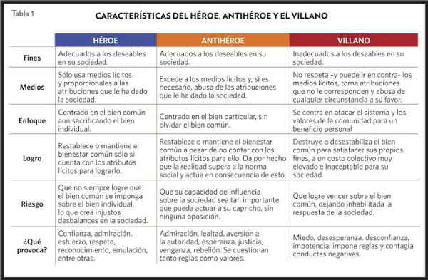 La tabla 1 presenta algunas características diferenciales de los tres roles: héroe, antihéroe y villano. El antihéroe comparte diversos rasgos tanto con el héroe como con el villano; puede verse desde ambos ángulos y podemos resumir su actitud en la frase: <<el fin no justifica los medios>>.
